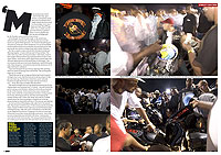But the car park is a raucous hub-hub of exhaust smoke and whining engines; teaming with around 100 gleaming high-end sports motorcycles. It’s a carnival atmosphere and the bikes’ owners have a piratical look. They wear du rags with top of the line Vanson bike leathers. T shirts are worn over the top with images of murdered rap superstars The Notorious Big and Tupac Shakur. Gold chains and gold-capped teeth glitter in the amber haze of street lights alongside waxed tanks and chromed wheels. Many have patches on the backs of their jackets declaring membership of motorcycle clubs like Baad Boys Sports Riders or the Maryland Rebels.