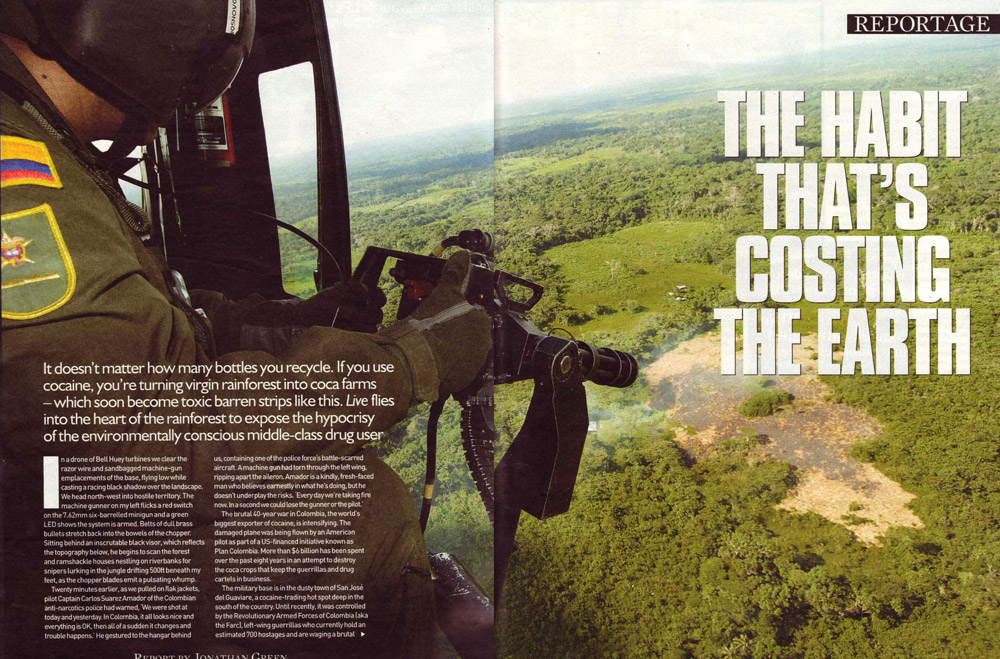The death and bloodshed meted out by the drug barons obscures the huge environmental damage being caused by the cultivation of coca. Ironically, the demand for cocaine is being fuelled by middle-class professionals – social drug users who shout their green credentials with Greenpeace stickers on their Toyota Prius hybrid cars, but are unwittingly aiding the destruction of the jungle. For every gram of cocaine bought in the West, 4.4 square metres of this diverse forest are lost forever.